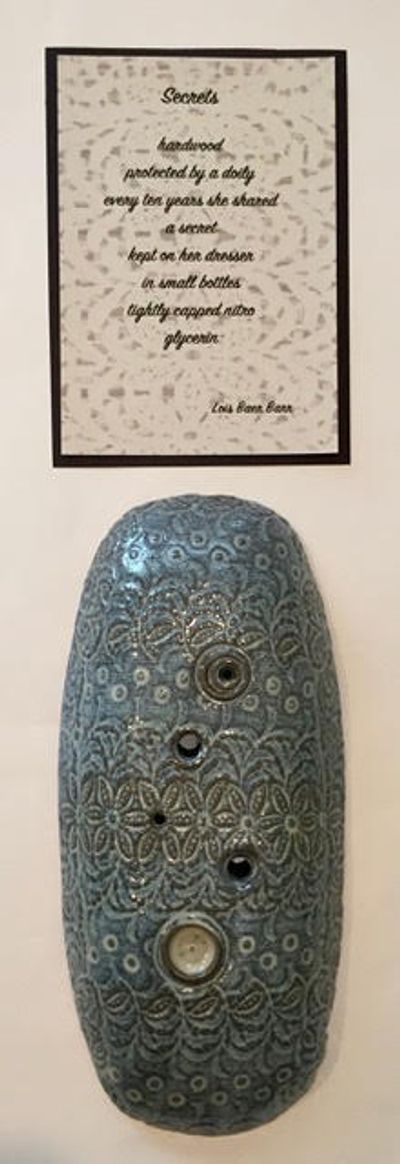 Barr and ceramicist Judy Solomon have collaborated many times. Their work "Secrets" (at left) will be exhibited at The Art Center of Highland Park March 2020. Her poem "Calling" (see Photo Gallery below) was a collaboration with graphic artist and photographer Sam Bernstein and calligrapher Nessia Frank.